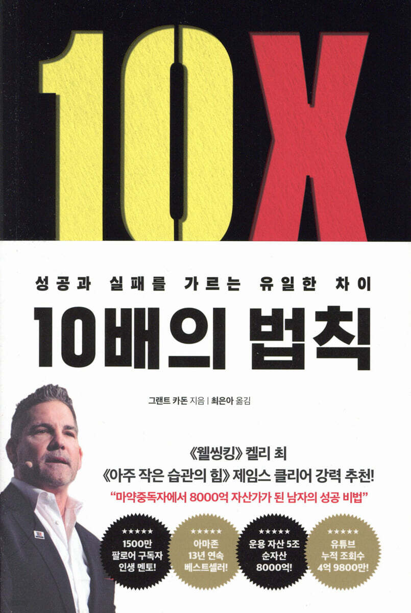 그랜트 카돈의 10배의 법칙은 성공을 원하는 사람들이 기존의 목표와 행동 수준을 10배로 높이는 전략을 다룬다. 대부분의 사람들이 목표를 작게 잡고 적당한 노력만 기울이기 때문에 기대만큼의 성과를 얻지 못한다. 저자는 "성공은 보통 수준의 노력이 아닌 압도적인 행동에서 나온다"고 강조하며, 더 큰 목표를 세우고 더 많이 행동해야 한다고 말한다.